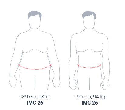 Hay que recordar que el cálculo del IMC en deportistas puede confundir debido a su cantidad de masa magra (músculo), lo que hace sospechar que el deportista tiene un ligero sobrepeso, pero no es más que un exceso de peso muscular, como vemos en el ejemplo dos personas con el mismo peso y altura tienen el mismo IMC aunque uno tiene más masa grasa y el otro masa magra.